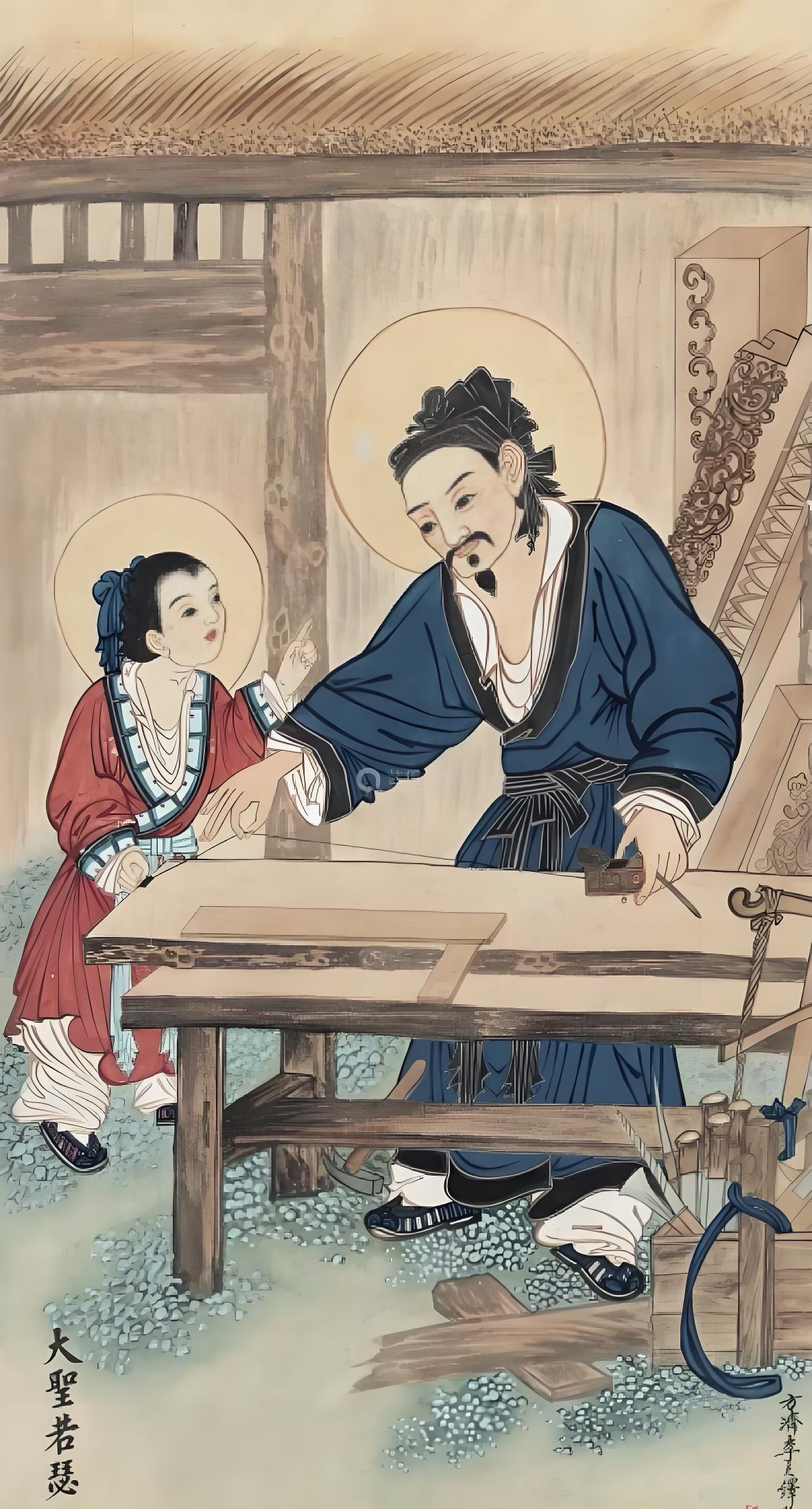 大圣若瑟流传于世的形象大多是一位朴实无华的木匠。若瑟是圣母玛利亚的净配,耶稣的养父,而若瑟又是以色列王达味的后裔,当然主耶稣就有了一个真实且合法的达味后裔的身份,应验了当天主拣选达味为王时给达味所誓许的:“你的后裔必世代为王”。作为达味之后,圣家之长的若瑟,是天主所拣选的,肩负着帮助耶稣完成救恩的神圣使命。