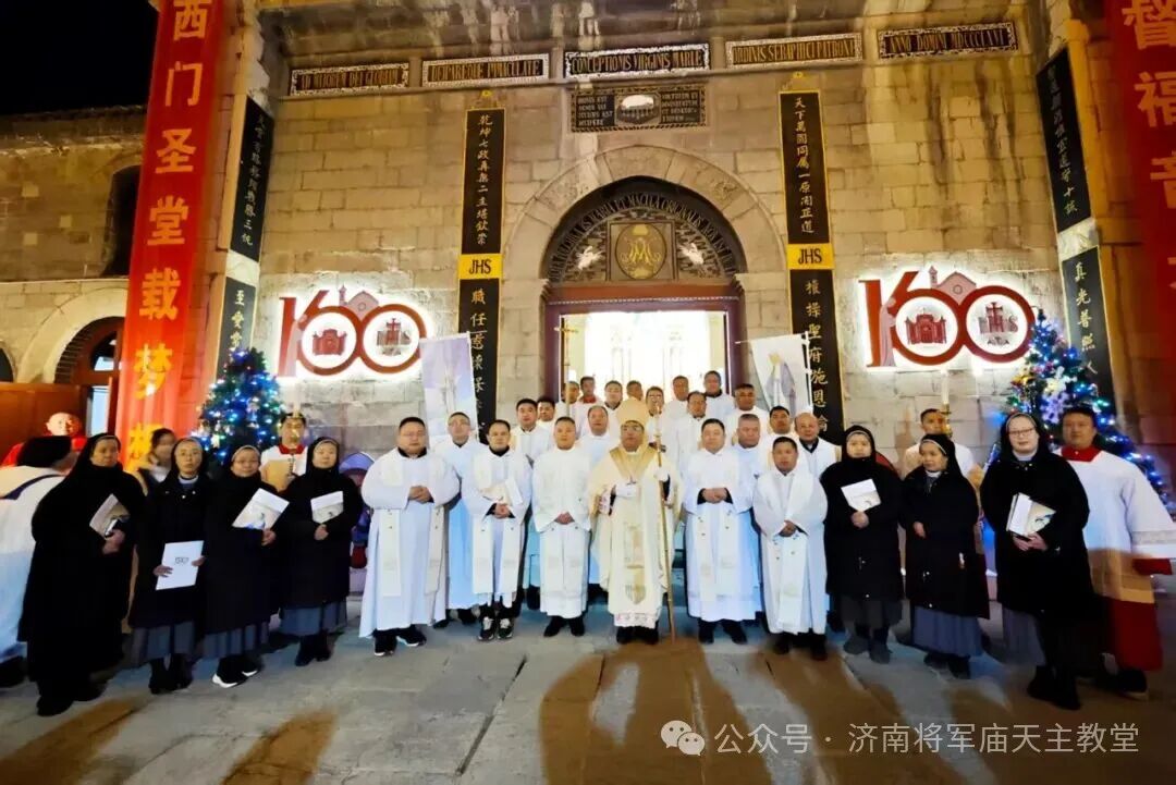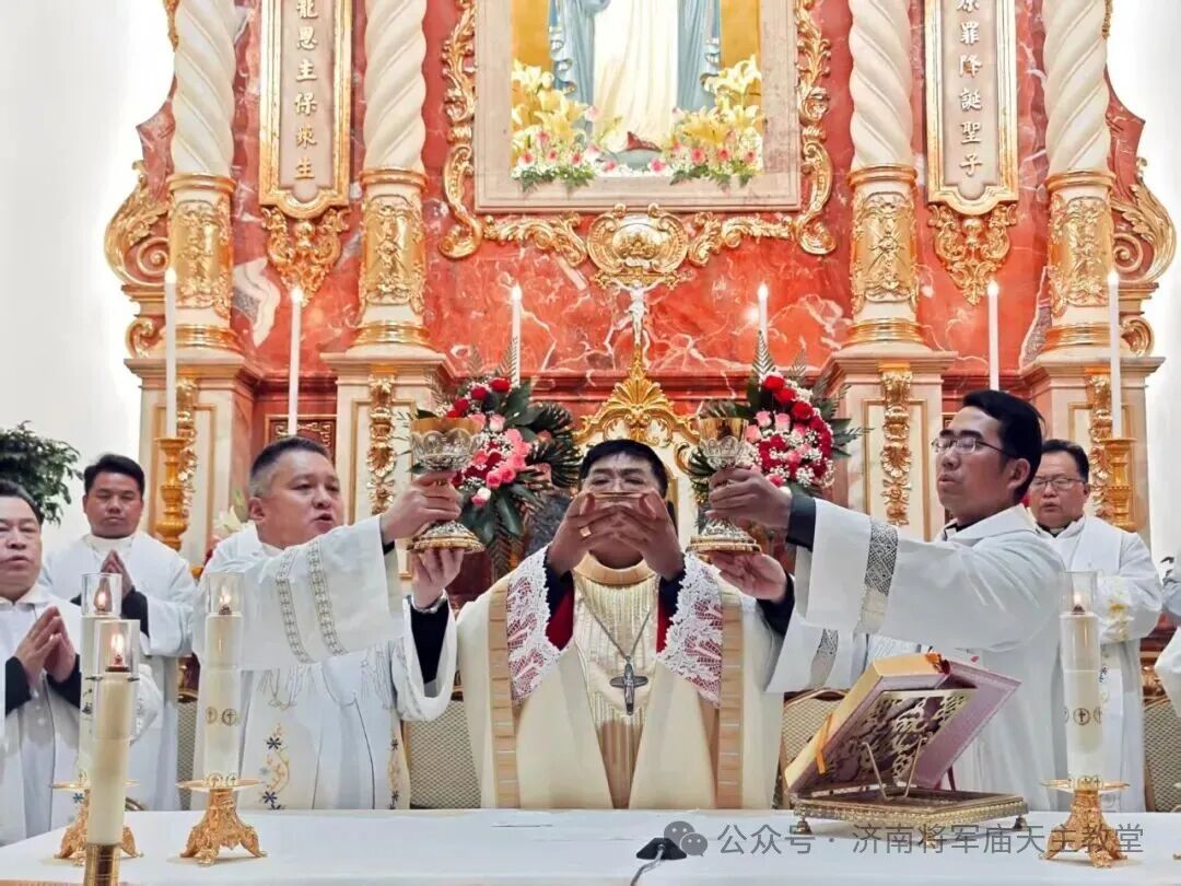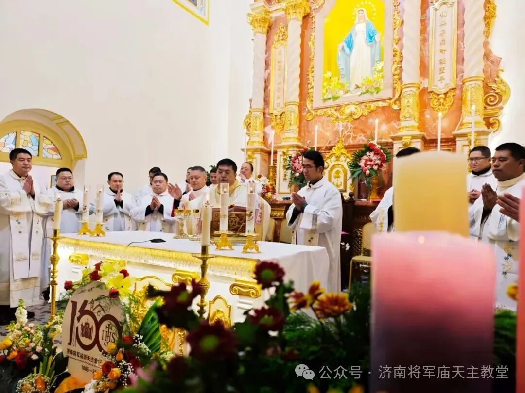与此同时,将军庙街天主堂圣母始胎无染原罪主保瞻礼暨建堂160周年庆典启动仪式的帷幕也被缓缓拉开。弥撒圣祭由济南教区张宪旺主教主祭、本堂韩承博神父和季宝玉神父襄礼,济南教区肖建国、袁广义等17位神父共祭,150多位教友参礼,共同见证了这一感恩、喜乐且神圣永久的美丽盟约。