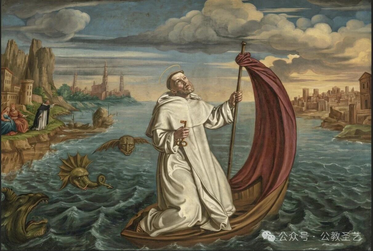 当时,他随詹姆士王赴地中海的玛约加岛。詹姆士生活放荡,虽然发了悔改的诺言,但到了岛上立即食言,赖孟多大怒而回。 国王不准,并传旨凡将船只借与圣人使用的,立即处死。 他大踏步跨上海面,将自己的大氅铺下,当作船舶,将衣角扎在竿上作风帆。 玛约加岛距巴塞罗那城有160里的距离。他踏在大氅上,飘浮海面,神风吹送,异常快捷,六小时后安然渡过海面,抵达目的地。赖孟多拾起大氅,干无滴水,照常披在身上,返回修院。