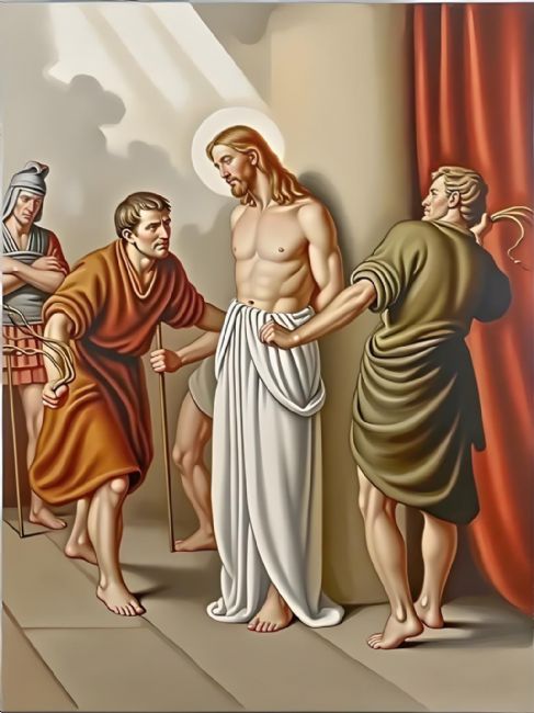 献、毅然坚忍之母玛利亚。我献此经,默思母心痛苦。圣子耶稣,令仪令容,超绝万众。今在比拉多衙内,尽褫(chǐ)其衣,系之石柱,鞭责五千四百有奇。全体剥伤,血流不止。苦痛如是,耶稣默不置辨,有如羔羊。